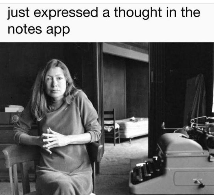 J’adore Joan Didion ! Quelle ironie que ses journaux privés aient été publiés ! Je n’ai aucun mal à me tenir au journaling, j’en ai limite besoin pour ma santé mentale, en revanche, écrire pour un public (comme sur substack), je dois me forcer. Et pourtant, cela me rend si heureuse quand je le fais !